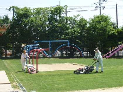 学校運営協議会「緑のボランティア部会」は,定期的に芝刈りをしたり,肥料を入れたりして,芝生ランドの管理をしています。