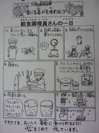 学級で見ている献立表に「給食調理員さんの一日」が