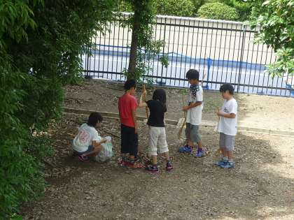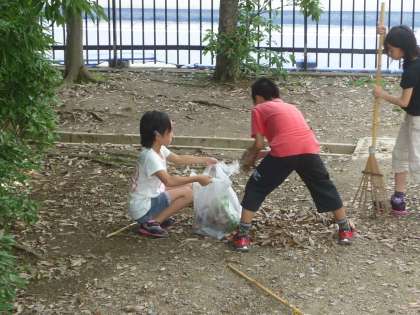 5年生は掃除の時間にアルプスの北側の枯れ葉を集めて袋に入れています。
