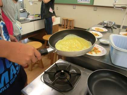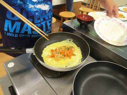 まず最初に野菜炒めを作ります。次に卵に牛乳を加え,フライパンにうすくのばします。最後に,野菜炒めを入れ,卵で包みます。ここが一番難しいところです。