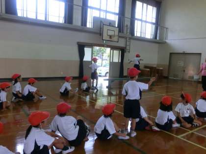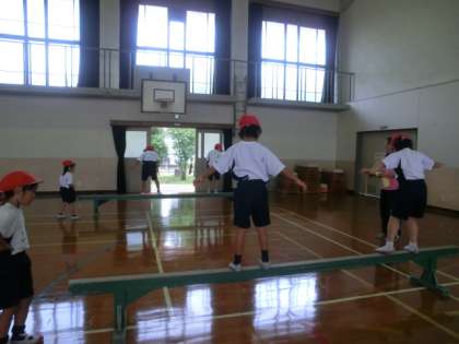 体育館では,「平均台あそび」の学習でした。平均台を真っすぐに歩いたり,横歩きをしたりしました。上手にバランスをとって歩くことができました。