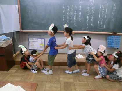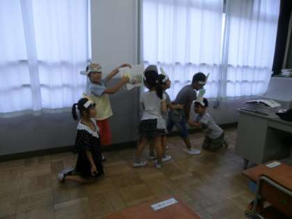 「大きなかぶ」の学習の後半は,グループで劇をします。登場人物のお面をつけて楽しく練習していました。お面をつけるだけで,その人物になりきり,演技していました。何より楽しいところは「うんとこしょ。どっこいしょ。」の動作です。