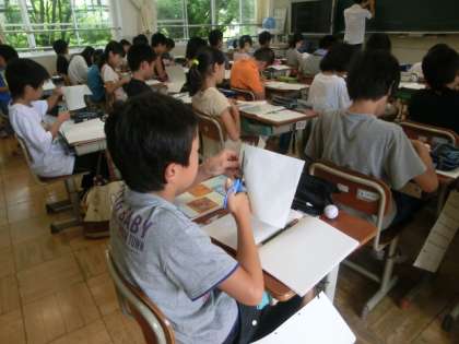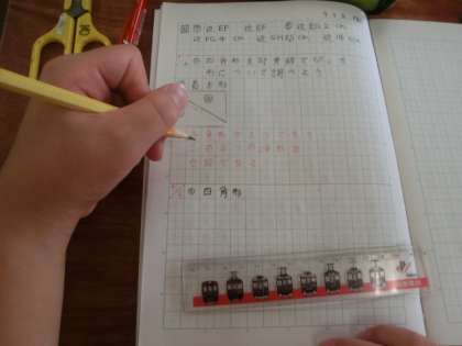 平行四辺形や台形を,対角線で切ってできる図形はどのような形をしているのか,2つの図形はどんな関係があるのか,予想しながら,実際に図形を書いて,切って,比べたり重ねたりしながら調べていきます。さすが5年生,ノートのとり方が上図です。