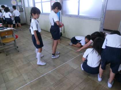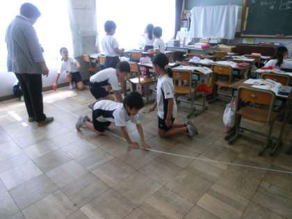 『巻き尺を使って,いろいろなものの長さを測る』学習です。今日は,グループで役割分担しながら,教室の縦と横を測りました。