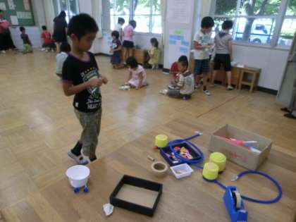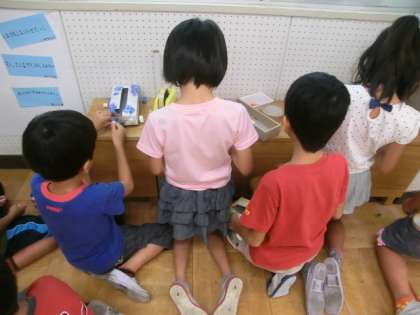 単元「あそんで ためして くふうして」の学習では,身近にある物を使って,遊びや遊びに使う物を工夫して作っていきます。今日の学習のめあては「もっと〜な車にするために しくみやうごかし方をくふうしよう」です。みんな,自分の思いや考えをもって活動していました。