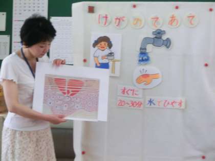今日は,6年生の身体計測です。そして,養護教諭による保健指導「けがの手当て〜やけど〜」についてのお話がありました。以前,3年生の身体計測では「鼻血の手当て」でしたが,いずれのけがも学校でよく起こるものです。やけどは『すぐに水で冷やす』のが一番の方法です。