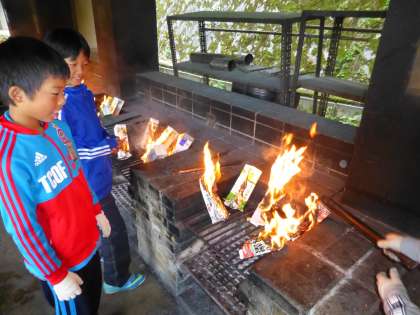 パンにキャベツとソーセージをはさんで、アルミホイルに包んで、牛乳パックに入れて燃やします。