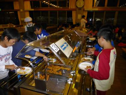山の家へ来て初めて食堂で食べる食事です。バイキング形式になっていて自分の好みでお皿に取っていきます。栄養のバランスを考えて食べる子もいれば、とにかく好きなものをたっぷりとという子もいてワイワイガヤガヤ、楽しく食事ができました。