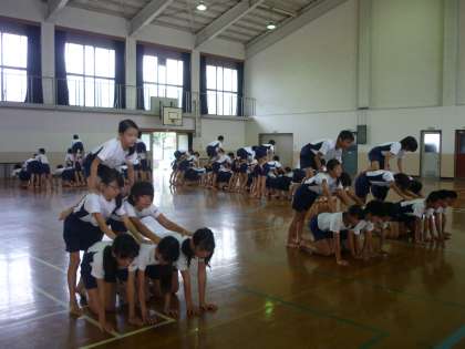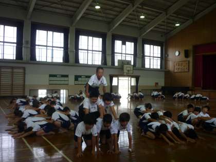 6年生の組体操は,それぞれの技を音楽に合わせて行っていく練習をしています。