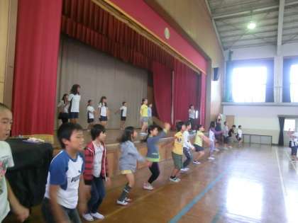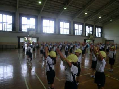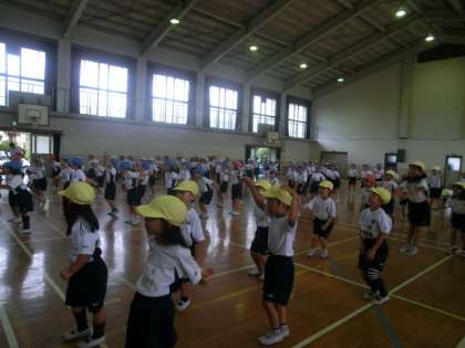 中間休みに体育館で全校体操の練習をしました。5・6年生の全校体操係のリードのもと,頑張っていました。