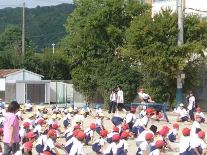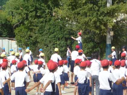 運動会を始める前の準備体操ですので,曲げるところ,伸ばすところに気をつけて行いました。