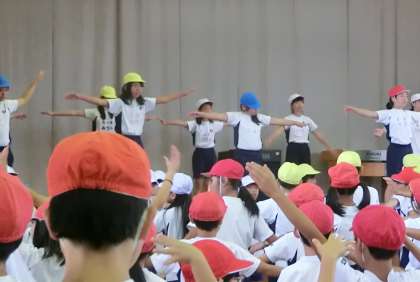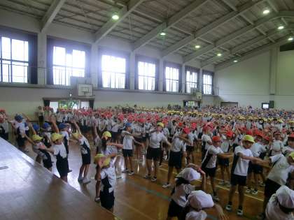 昨日の雨で運動場での練習ができなかったので,今日の全校練習は体育館で行いました。準備体操も上手にできました。