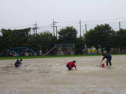 雨があがったら何とか実施したいと考え,7時前から運動場のブルーシートを片づけたり,水をとったりするなど,教職員で準備を始めています。
