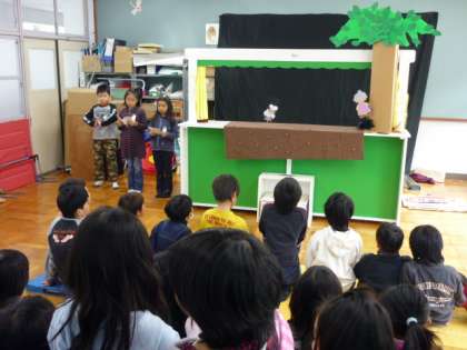 たくさんの子どもたちが観にきてくれて,「てっきりどんぐり」(ペープサート劇)を楽しんでいます。