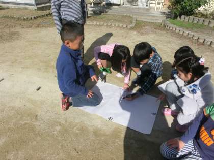 方位磁針を使って,時間ごとのかげの向きを調べています。「かげのむきが少しうごいているね。」と互いに確かめ合っていました。いいことに気づいてくれました。