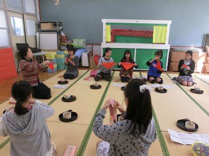 山道盆に茶碗・棗等を並べ,帛紗さばきの稽古をしています。この帛紗さばきは思った以上に難しいものです。練習を重ねていきましょう。