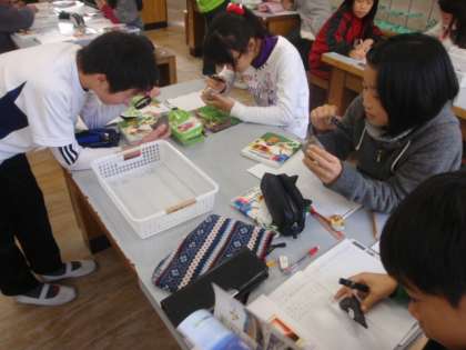 地層でできた岩石について,虫めがねや手ざわりで,その岩石が何からできているか調べました。