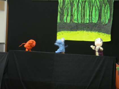 今日は絵本サークル「本のたね」の方たちが人形劇に初挑戦。キーボードを使った効果音や音楽に合わせた人形劇「ねずみのすもう」を参加した子どもたちは食い入るように見つめています。パネルシアター「すてきな帽子屋さん」では,子どもたちが参加しながらお話の世界にひきこまれていました。