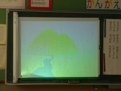 1年生は国語の「あめふりくまのこ」で,コンピュータやスクリーンを使って学習しました。