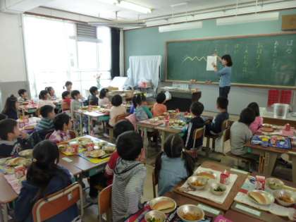 配り終わっても,まだ「いただきます」はできません。献立や机の上での置き方を確かめ,ゼリーのスプーンやカップの片づけ方を教わり,牛乳パックにストローをさす練習もします。
