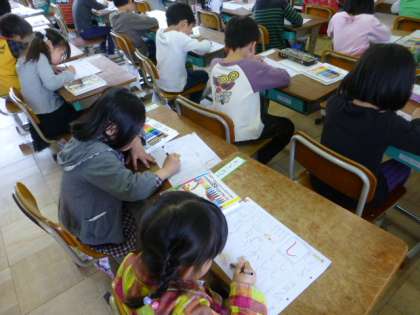 今日はひらがな「し」の練習をしたり,「うたに あわせて あいうえお」を繰り返し読んだりして,入学してまだ10日もたってないとは思えないぐらいでした。
