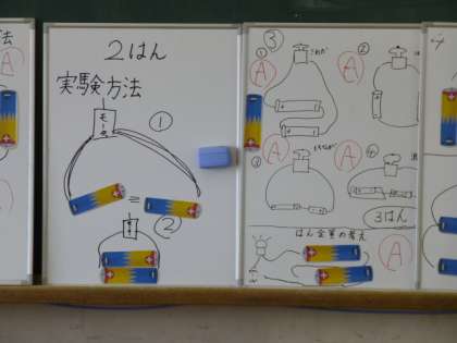 「モーターを速く回したり,豆電球を明るくしたりするには,どうしたらよいのだろうか。」という学習問題についての予想をグループごとに考えて,確かめ合っています。みんなで考えると,一人では思いつかないようなことに気づいたり,自分の考えが広がったりしていきます。