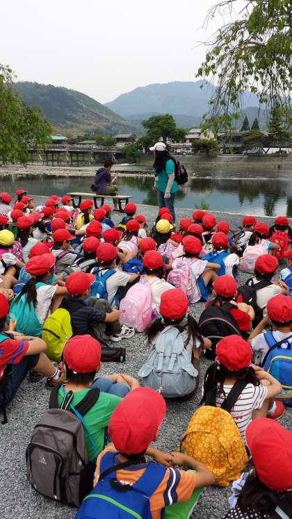 渡月橋に到着しました。川辺にコサギを発見しました。観光地ではありますが,学校の中だけでは体験できない自然についても学んでいます。