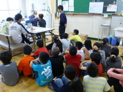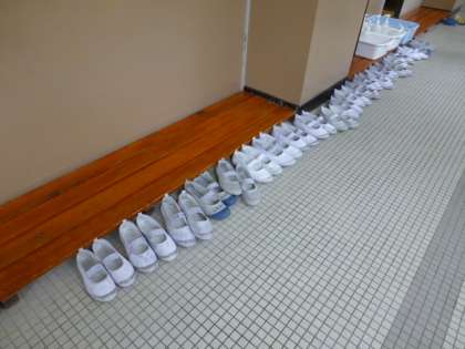 保健室前では上ぐつをきれいにそろえ,静かに検診を受けています。