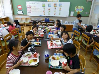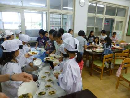 4時間目に指導を受けたクラスはそのままランチルームで給食を食べます。いつもと違った雰囲気の中で給食を食べると,会話もはずむことでしょう。