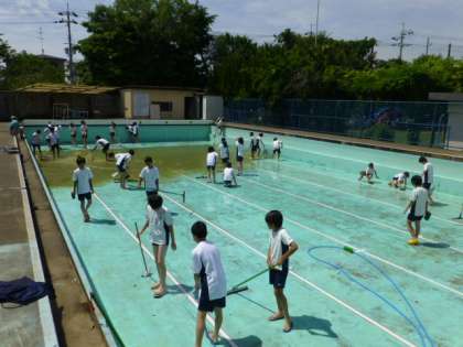1校時から4校時まで,6年生の各学級の児童がプール清掃をしてくれました。防火用水として濁った水の入っていたプールは,見違えるように美しくなりました。6年生の皆さん,ご苦労様でした。