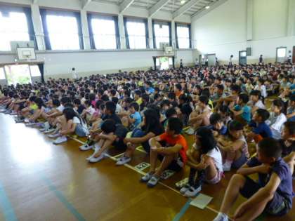 今年度初めての児童集会が開かれました。6年生は新リーダーとして下級生の先頭に立って,フレンドリーグループをまとめてくれています。その顔からは,リーダーとしての自覚がうかがえます。また,下級生もしっかりと話を聞いています。