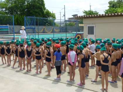 今日から低水位での水泳指導が始まりました。学校のプールでの水遊びは2回目の2年生。約束事をみんなで確かめ,準備運動をして,さぁシャワー!