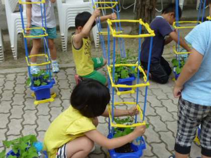 春に種まきをした1年生のアサガオが,この時期になってぐんぐん伸び始めました。つるも出てきたので,支柱を立てることにしました。わたしのアサガオさん,元気に育ってね。