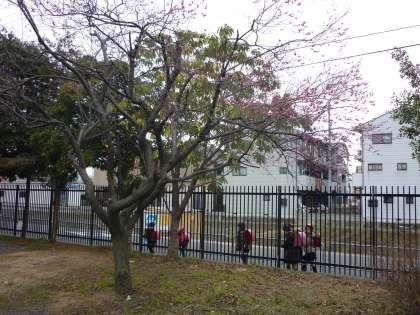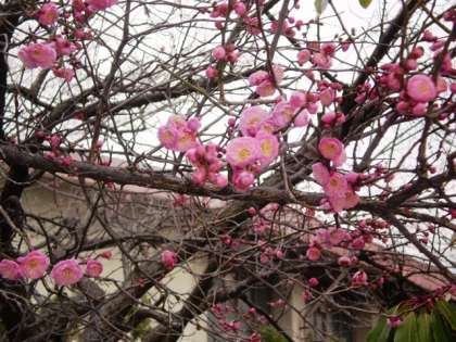 学校のプールの東側に梅の花がきれいに咲いています。