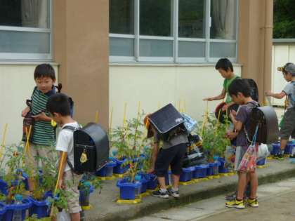 登校した2年生が向かうのは,自分のミニトマトの鉢植えと夏野菜の畑です。時には芝生の上にランドセルを放り出して,野菜の世話をしています。畑の作物だけではなく,地面をはっている虫にも子どもたちの注目が集まります。