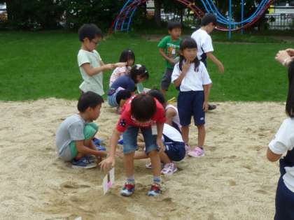 1年生は生活科で「きせつとあそぼう」という学習に取り組んでいます。おうちから持ち寄った洗剤やマヨネーズなどのカラ容器に水を入れ,飛ばしっこをしたり,砂場に立てた旗の的倒しをしたり,水遊びを楽しみました。