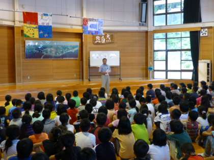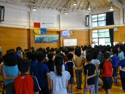 初めての朝の集いは校歌を歌いながら旗上げをした後、学校紹介をします。下鳥羽小学校の人たちとは3日間一緒に過ごします。