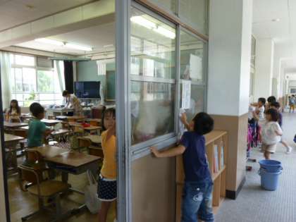 夏休みに入る前に,教室やろうかをピカピカにしています。みんな汗を流しながら一所懸命です。