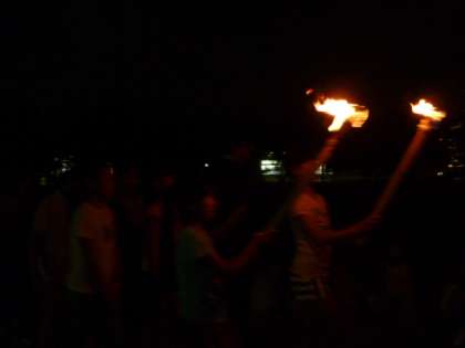 時々雨粒が落ちてはきますが,7時半から予定通りキャンプファイヤーが始まりました。まずはトーチを持った班長さんたちの入場です。