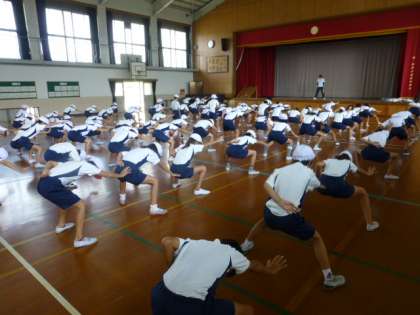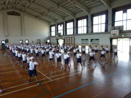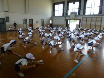 4年生は体育館で,運動会の団体演技「ソーラン節」の練習をしています。腰を落とし,足をしっかり踏ん張って,力強い踊りになるようにがんばっています。