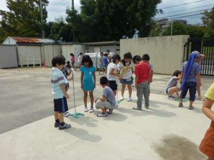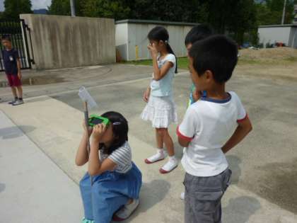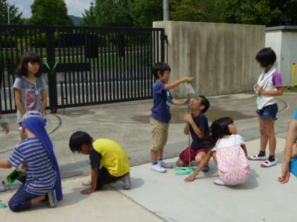 3年生は理科の学習「太陽のうごきと地面のようすをしらべよう」で,かげのでき方に着目して太陽の動きを調べています。少しの時間で棒のかげが移動しているのを発見した子どもたちからは,驚きの声が上がっていました。