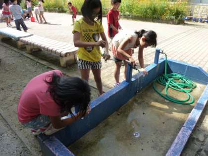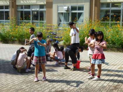 今日は,筒の中に空気と水とを半分ずつ閉じ込め,それを押したときの様子や手ごたえからどんなことがわかるのかを,みんなで考えています。