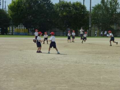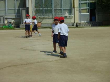 4組は「じんとりあそび」をしています。2チームに分かれて,地面に書かれた線に沿って陣地から出発し,出会ったところでドン,ジャンケン!地面の線がくねくねしているので,線からはずれないように一所懸命走ります。
