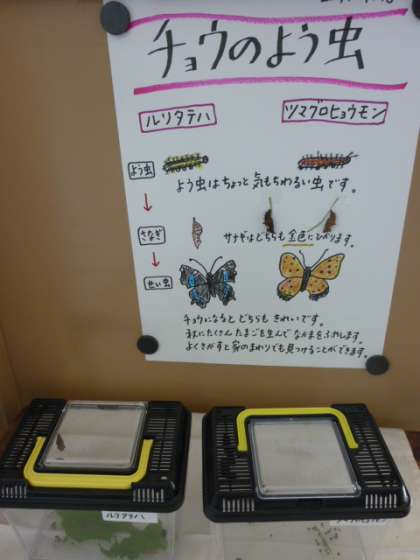 職員室前の理科コーナーでは,ルリタテハとツマグロヒョウモンの紹介をしています。ツマグロヒョウモンは幼虫のほかにさなぎも展示しています。黒地に赤の幼虫が,金色の点々をつけたさなぎに変身するところが不思議です。