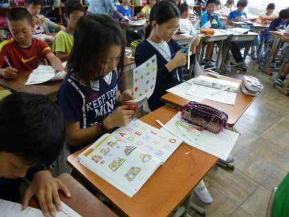 5年生は,英語活動で好きな色や形を尋ね合う練習をしています。ビンゴゲームを通して,ジェームス先生がどんな色や形を好きだと言っているかを聞きとります。