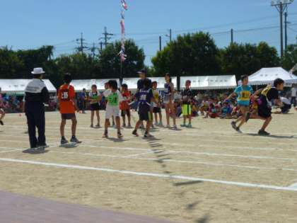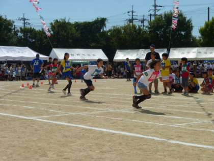 注目の小学生男女混合400mリレーです。各町内の期待を背負って懸命に走ります。