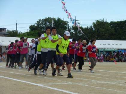 むかで競走には,5名の教職員がチームワークで奮闘しました。