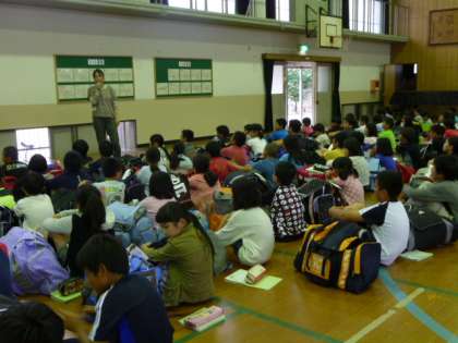 5年生は,山の家用の荷物を入れた大きなリュックを持ってきて,中身の点検を行いました。点検を終えた荷物は,プレイルームに班ごとに並べられ,当日の朝を待ちます。