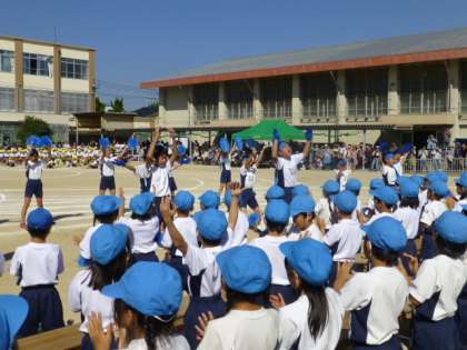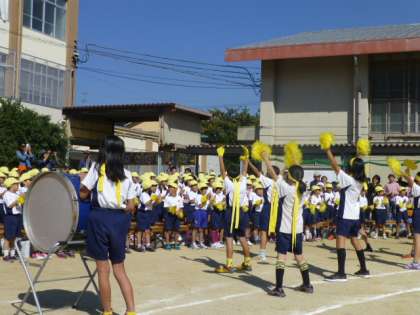 午後の部は応援合戦で始まりました。どの色も,優勝を目指して大きな声で応援しています。