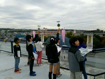4組のテーマは「ザ・竜巻」です。屋上から実際の天気の様子を観察しました。実験室にもどり,科学センターの道具を使って竜巻の発生実験をしました。